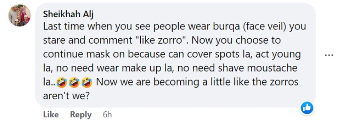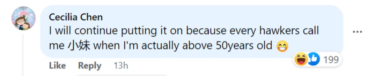这位年过50岁的大姐就说,她会继续戴口罩,因为每次去小贩中心买食物时,老板都会叫她“小妹”。