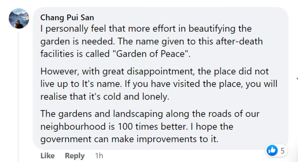 网民虽然都挺喜欢骨灰撒土这样的安葬方式,但认为目前“清心园”的环境美化工作做得不够。希望当局可以改进,让更多国人更容易接受和愿意使用这个服务。