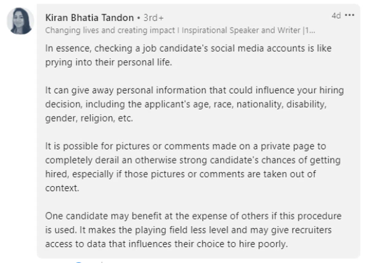 用公私分明的角度来看,应征者在社媒的行为属于个人生活范畴,招聘者跨过工作与私人生活的界限,审查应征者的是否属于越界是其中一大争议。
