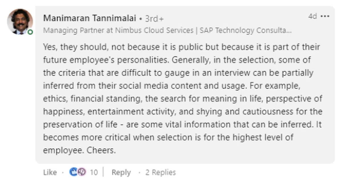 一名赞成雇主审查社媒的领英用户表示,这么做可以补足一些雇主难以单从面试中取得的信息:
