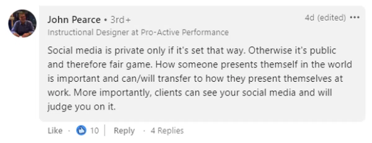 还有人认为,社媒只有在设为私密账号的时候,才完全属于个人空间。否则,社媒就是公共空间,一个人在现实中如何呈现自己,也将代表着他在工作上会展现出什么样的风貌。