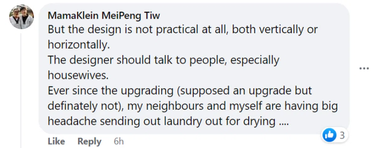 用户多认为,当局在设计和推出新的晒衣架时,应该向组屋住户收集意见,尤其是常晾衣的家庭主妇们。对于不少人来说,这个所谓的组屋升级计划,并没有让他们感到升级,反而降级了,晾衣服成了一个头痛的问题。