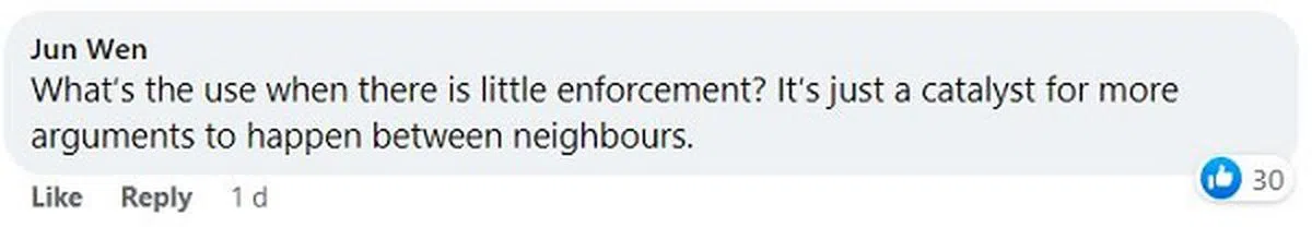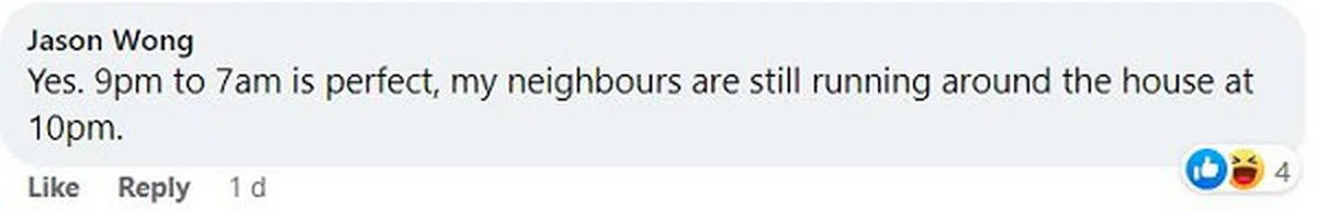 另一名网民则说,可考虑将清静时段提前至晚上9点至隔天早上7点,因为“我的邻居晚上10点还在屋内四处跑动”。