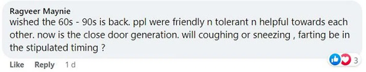 “很怀念60年代至90年代,当时人们对彼此都很友善、宽容,也互相帮忙。现在已是‘闭门’世代,那咳嗽、打喷嚏甚至放屁,会不会也被算在清静时段内(需禁止的行为)?”
