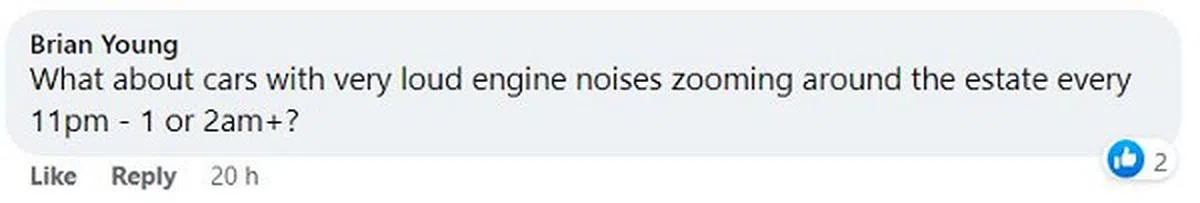 另一边厢,有网民也反映,在晚间11点至隔天凌晨一两点,都会有汽车在社区内风驰电掣,发出巨大的引擎声响,这个问题又该如何处理?