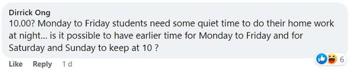 该网民说,星期一至五晚上,学生需要一些安静的时间做功课,他因此反提议,能否再进一步提前周一至五的清静时段,将周末的清静时段保留在晚间10点开始?
