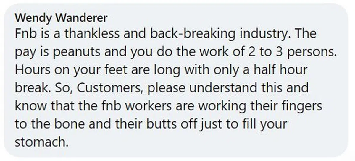 “(在餐饮业工作)工资很低,员工又要一人做两、三人的工作,还要长时间站着,可能也只有半小时的休息时间。所以,请消费者明白这点。餐饮业员工都非常辛苦地工作,只为让你填饱肚子。”