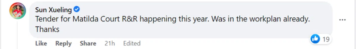 该区议员孙雪玲也在上述贴文留言指出,修复和重新装修项目已在计划中,今年就会招标。