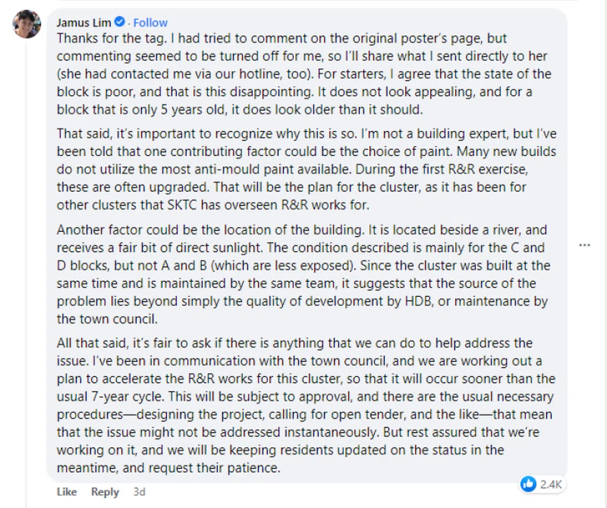 林志蔚留言坦承组屋状况不佳,令人失望。对于一个只有5年屋龄的组屋区来说,它看起来确实比实际屋龄要老旧很多。