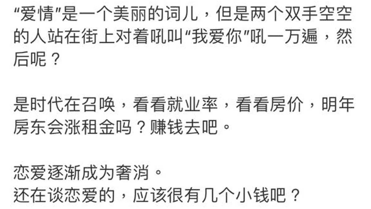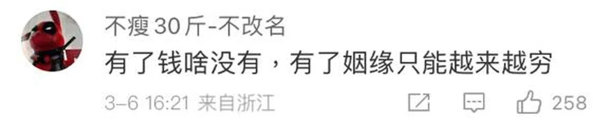 还有网民说这年头“没爱可以,没钱是真不行”,反正如今“爱情也归财神管”,一语道破当今年轻人“没钱拿什么谈爱情”的无奈。