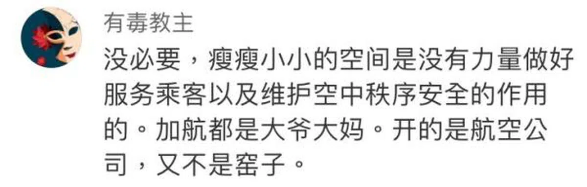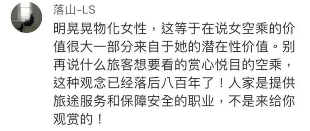 “明晃晃物化女性,这等于在说女空乘的价值很大一部分来自于她的潜在性价值。别再说什么旅客想要看的赏心悦目的空乘,这种观念已经落后八百年了!人家是提供旅途服务和保障安全的职业,不是来给你观赏的!”