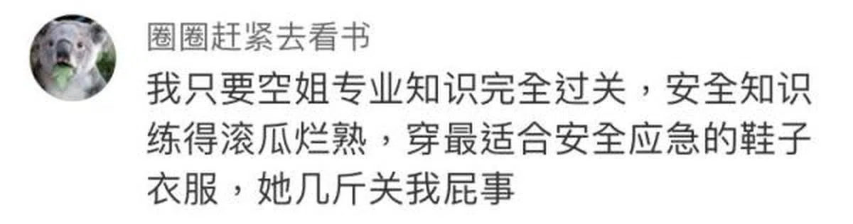 “我只要空姐专业知识完全过关,安全知识练得滚瓜烂熟,穿最适合安全应急的鞋子衣服,她几斤关我屁事。”