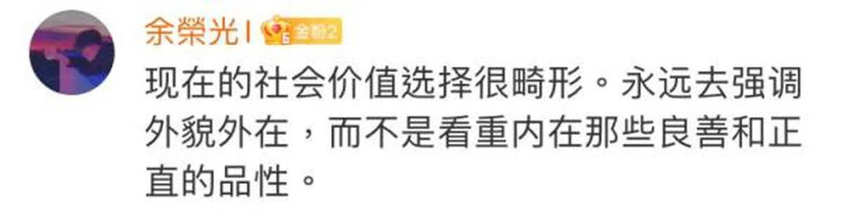 “现在的社会价值选择很畸形,永远去强调外貌外在,而不是看重内在那些良善和正直的品性。”