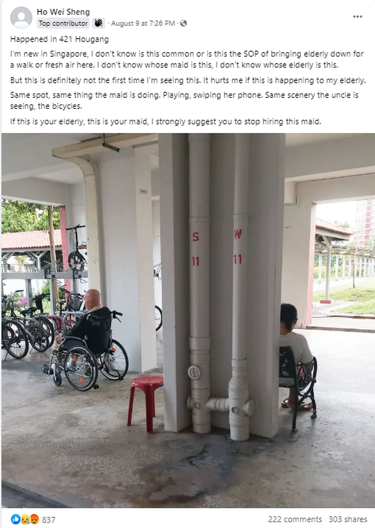 不少网民纷纷留言感叹这确实是本地常见的情景,尤其是老年人居多的组屋区,有些女佣三五成群聚在一起聊天,而把她们照顾的阿公、阿嬷或特需儿童晾在一旁一两个小时。