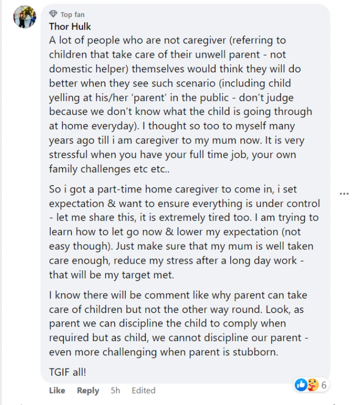 网民Thor Hulk就坦言,他曾经也会对老人家的看护者评头论足,甚至觉得如果同样的事情发生在自己身上,一定会做得比对方好。