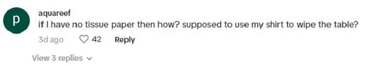 另有网民质问,如果用餐时没有携带纸巾,是不是得用衣服当抹布把桌面擦干净?
