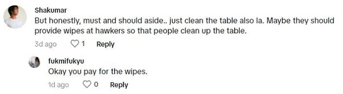 有网民认为,撇开“必须”与“应该”不谈,食客其实大可把桌面擦干净,还建议当局在小贩中心提供湿纸巾,让公众擦桌子。