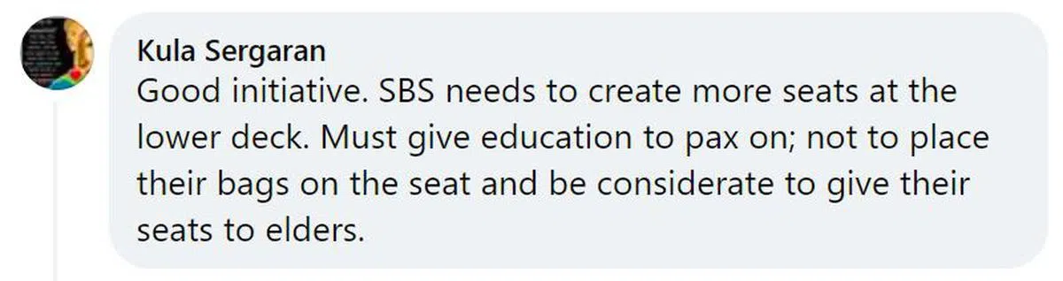 易塔通发言人回复《海峡时报》询问时也说,到最后乘客想坐哪儿是他们的自由,只希望巴士车长在表达关心后,年长者能听进去,自动培养出更高的自我安全意识。