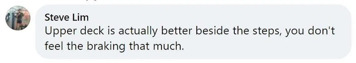 也有网民透露,其实坐在巴士顶层不一定不安全,“阶梯旁边的顶层座位反而更好,因为刹车的冲击力感觉不会那么大。”