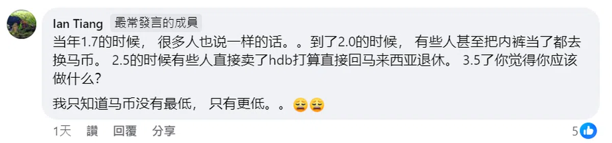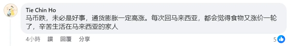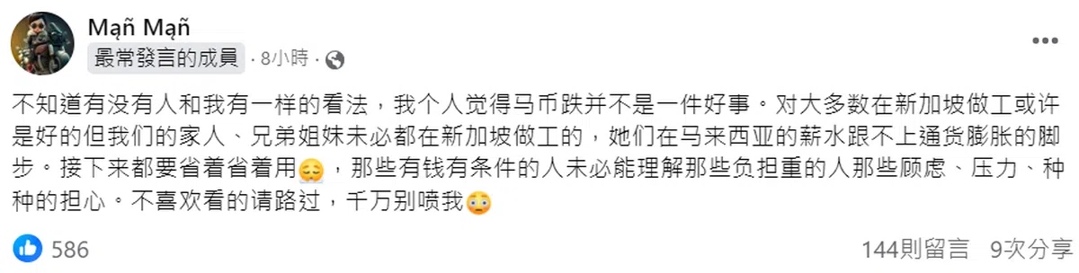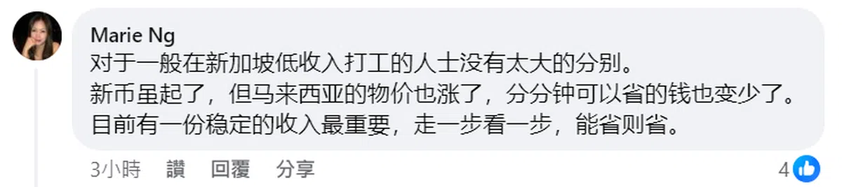 一名网民指出,对在新加坡工作的马国人而言,新元走强马币贬值或许是好事,但他们在马国的家人朋友,却深受薪资涨幅跟不上通胀之苦。