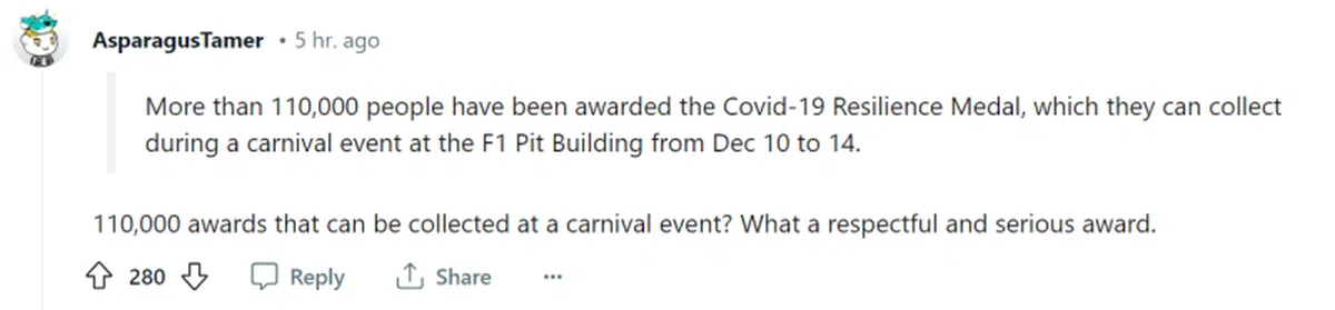 对于有获奖者出售抗疫奖章的行为,新加坡政府强调,他们应该尊重相关奖章。