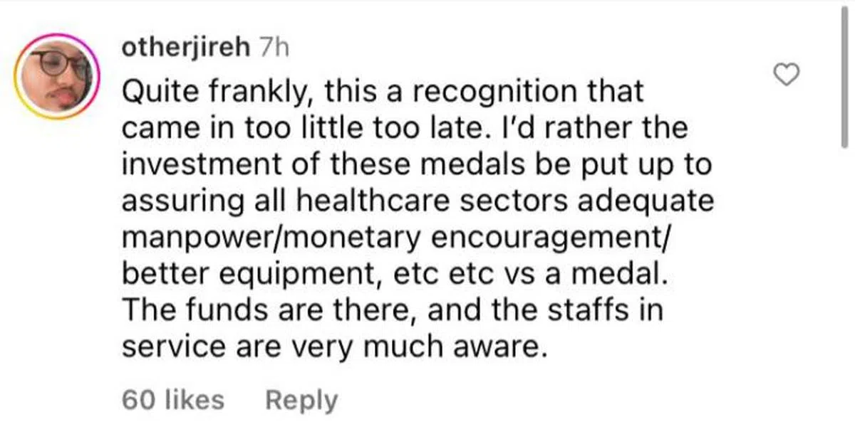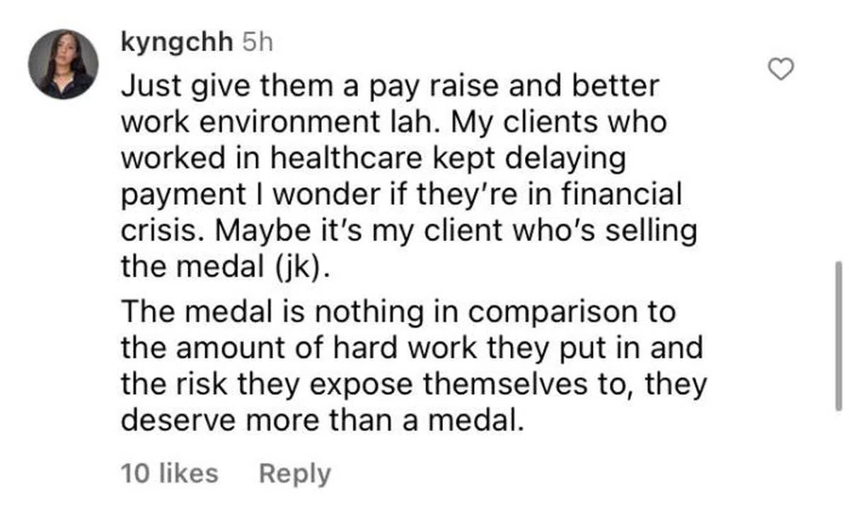 由一群本地医护人员以匿名方式经营的Instagram账号“诚实的医护人员”(@thehonesthealthcareworker)则发文指出,有人试图出售抗疫奖章是非常令人失望的。