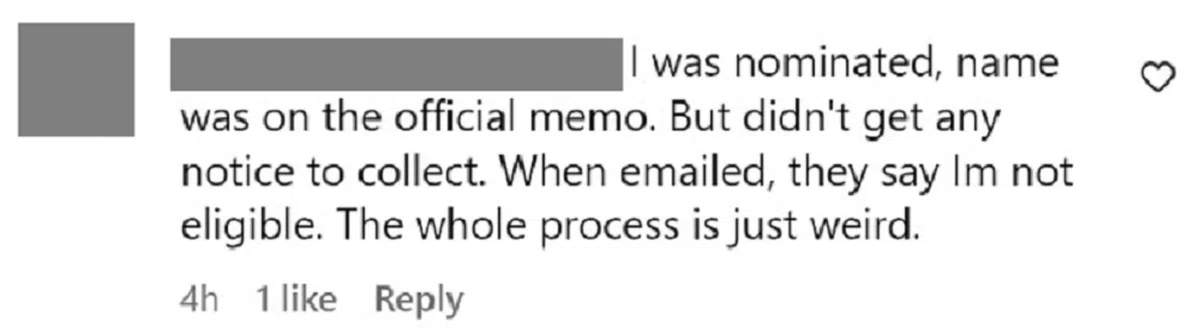 有被提名者说,他被提名了,也在获奖名单上看到自己的名字,不过没有收到任何领奖的通知。 当他发邮件询问当局时,对方说他不符合获奖条件。整个流程让他觉得很奇怪。