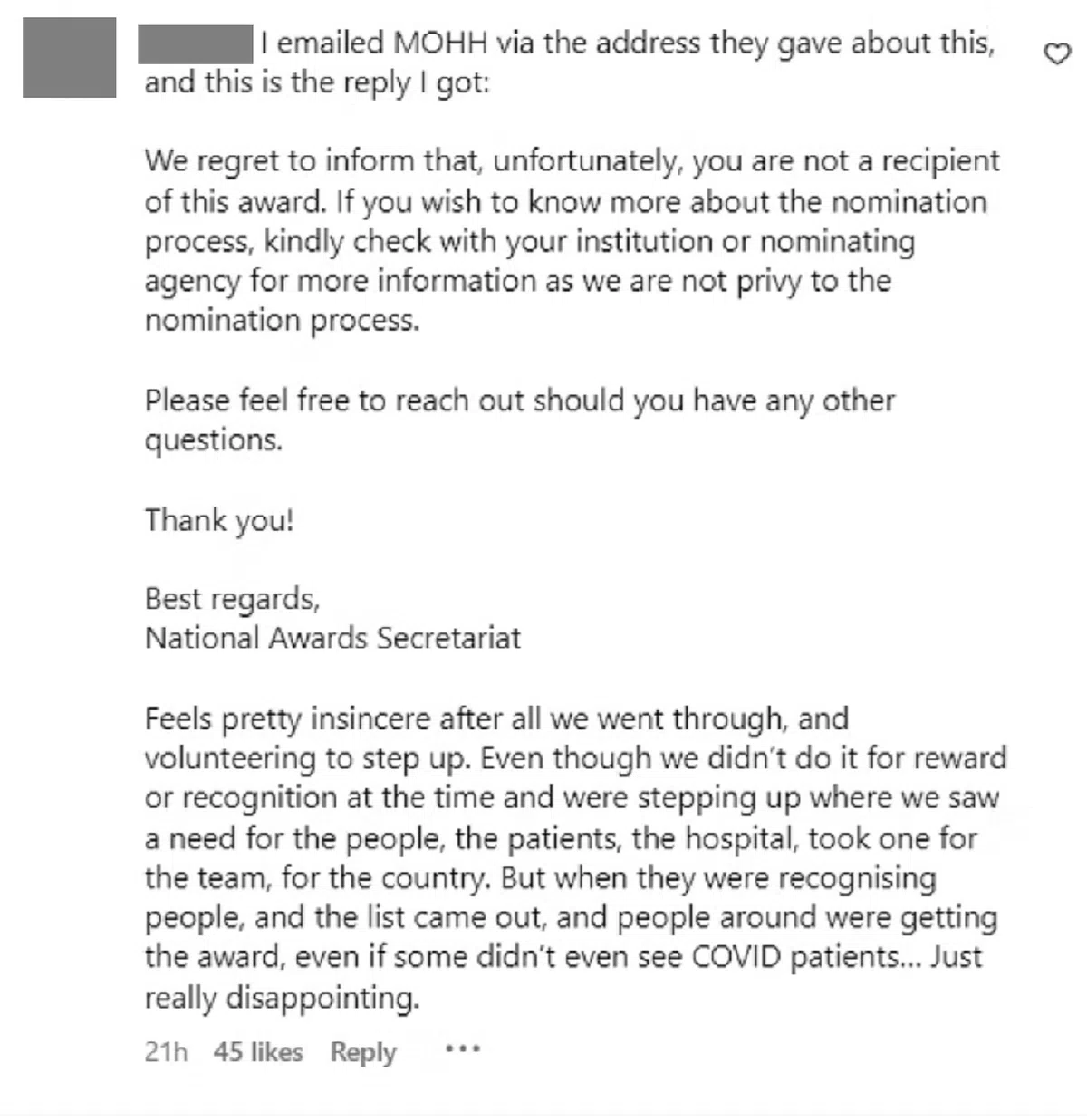在我们主动义务参与抗疫,经历了那么多之后,觉得这个回复很不真诚。尽管我们当时这么做并不是为了获得奖励或认可,而是在我们看到国人、病人、医院有需要我们的地方,为了团队,为了国家,而挺身而出。当国家在表彰作出贡献的人们时,名单出来了,周围的人都得到了奖励,甚至有些人不曾照顾过冠病患者的也获奖了,这真的很令人失望。