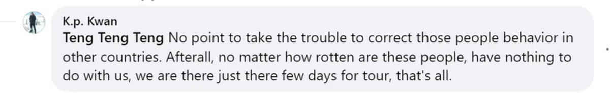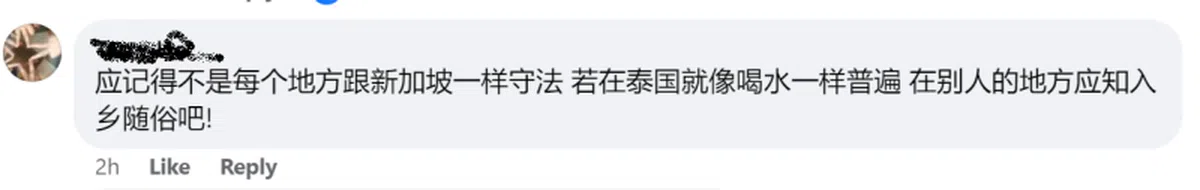 新加坡不少网民都认为,就算对方真的违法了,也轮不到旅客来管。毕竟,不是每个地方的民众都像新加坡人一样奉公守法。
