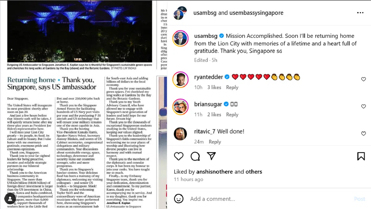 这位第17名美国驻新大使在自己的IG贴出今早(1月13日)刊登在《海峡时报》上写给新加坡的“情书”时写道: