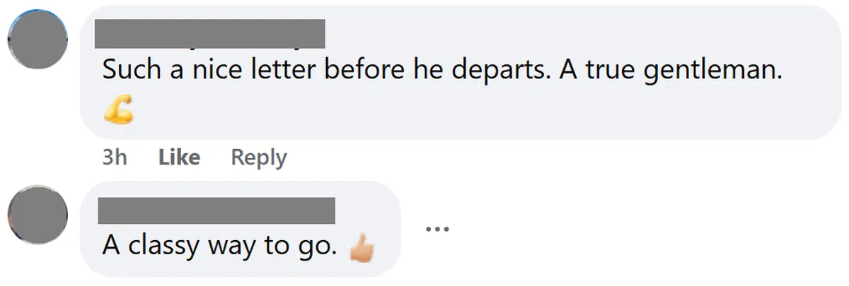 不少读者,包括资深媒体人、《海峡时报》前副总编辑默乐(Bertha Henson),都说这封信行文漂亮,卡普兰是一名真正的绅士,这种告别方式格调优雅。