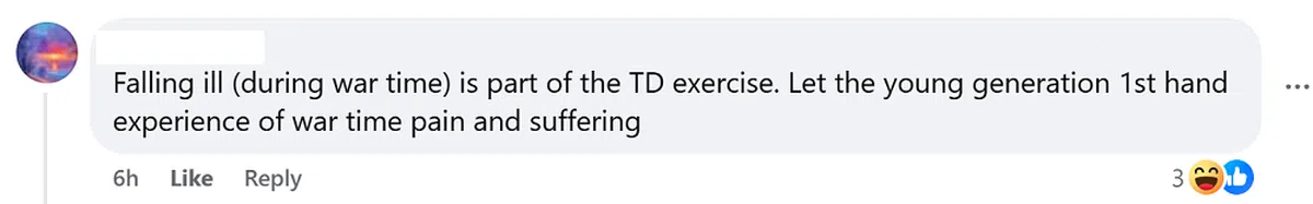 有网民挖苦地说,生病在战争期间是全面防卫演习的一部分,可以让年轻一代亲身体验战争时期的痛苦和苦难。
