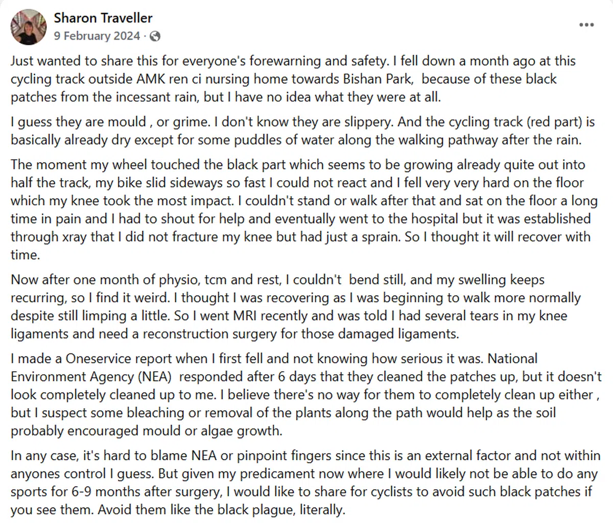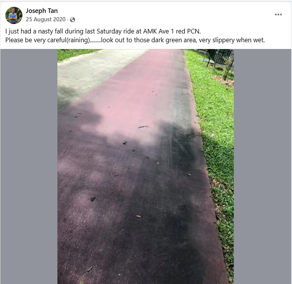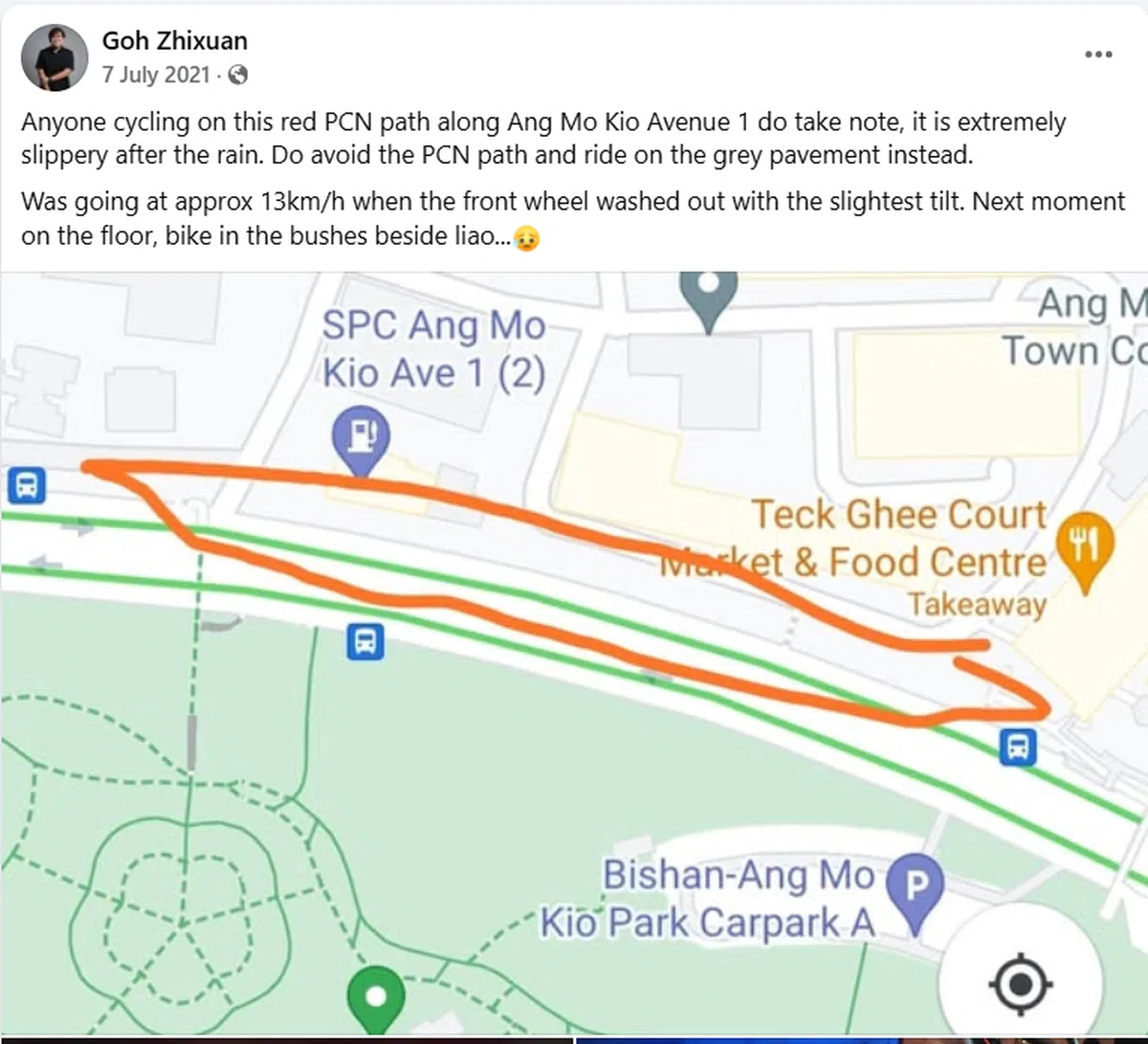 另一名骑士也在2021年7月7日提醒其他骑士,途经宏茂桥1道脚车车道时一定要特别注意,因为下雨过后那里会非常湿滑。当时骑得不快的他,速度是大约每小时13公里,前轮稍微一歪就瞬间打滑,下一秒人已经摔在地上,脚踏车也飞进路旁的灌木丛里了。
