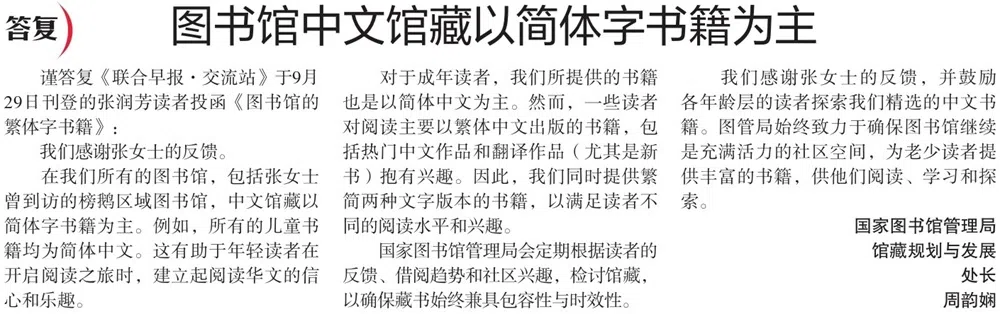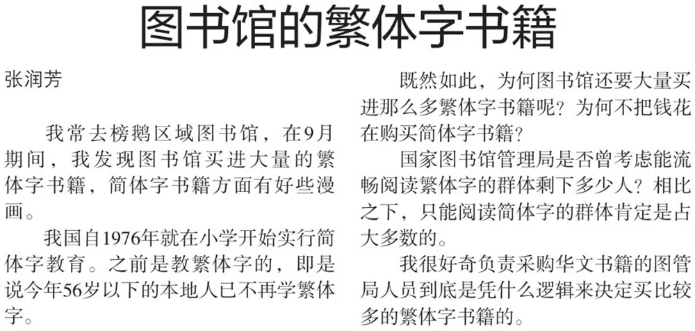 图书馆若能持续从不同地区采购华文书籍,“为老少读者提供丰富的书籍,供他们阅读、学习和探索”,而不被繁体字或简体字等因素所拘囿,那便是广大新加坡读者的福分了。