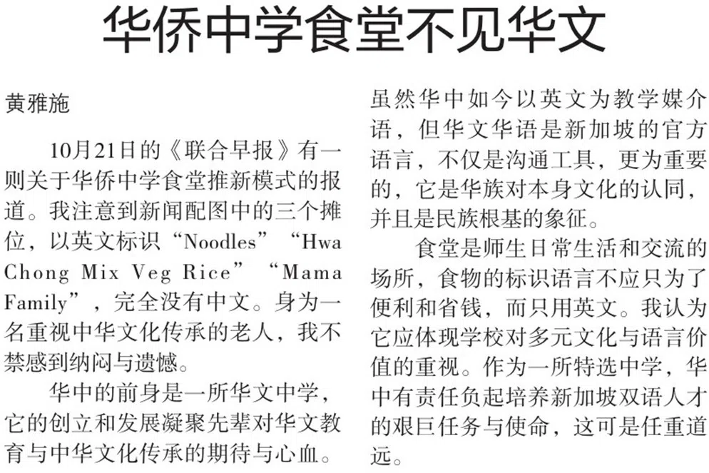 毕竟,在新加坡社会,就连一所中学食堂没有华文标记都有人会致函报章表示关注。