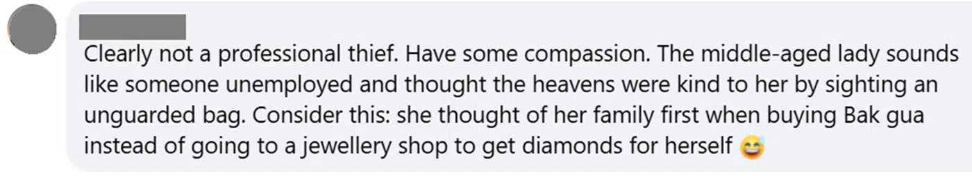 “一看就不是职业窃贼,多一点同情心吧!这位中年女士看到无人看管的包包,以为是老天对她格外眷顾。试想想:她去买肉干是因为先想到家人,否则为何不去珠宝店给自己买钻石?”