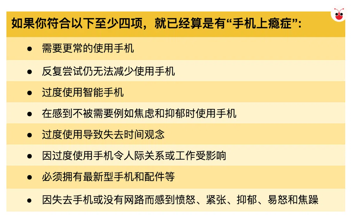 根据网站,已经不那么客气说是“手机依赖综合症”,而是以更严重的“手机上瘾症”(addiction)来解释这个行为模式。