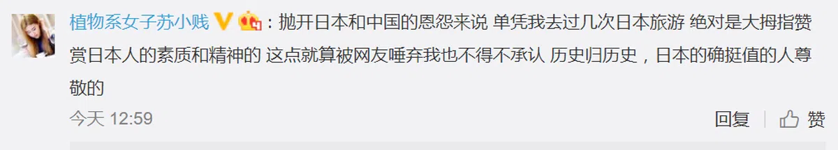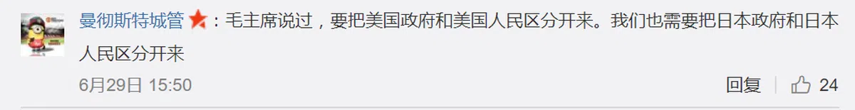 虽然中日因历史问题而关系复杂,但中国网民大多积极肯定日本球队和日本球迷的优点,微博上出现“#心疼本田圭佑#”,“#日本队虽败犹荣#”,“#日本队值得尊敬#”等贴文,网民大多认为政治和体育不应混为一谈。