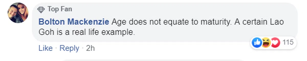 一位网民就开玩笑说:“年龄与成熟度并不对等。某位Lao Goh就是活生生的好例子。”