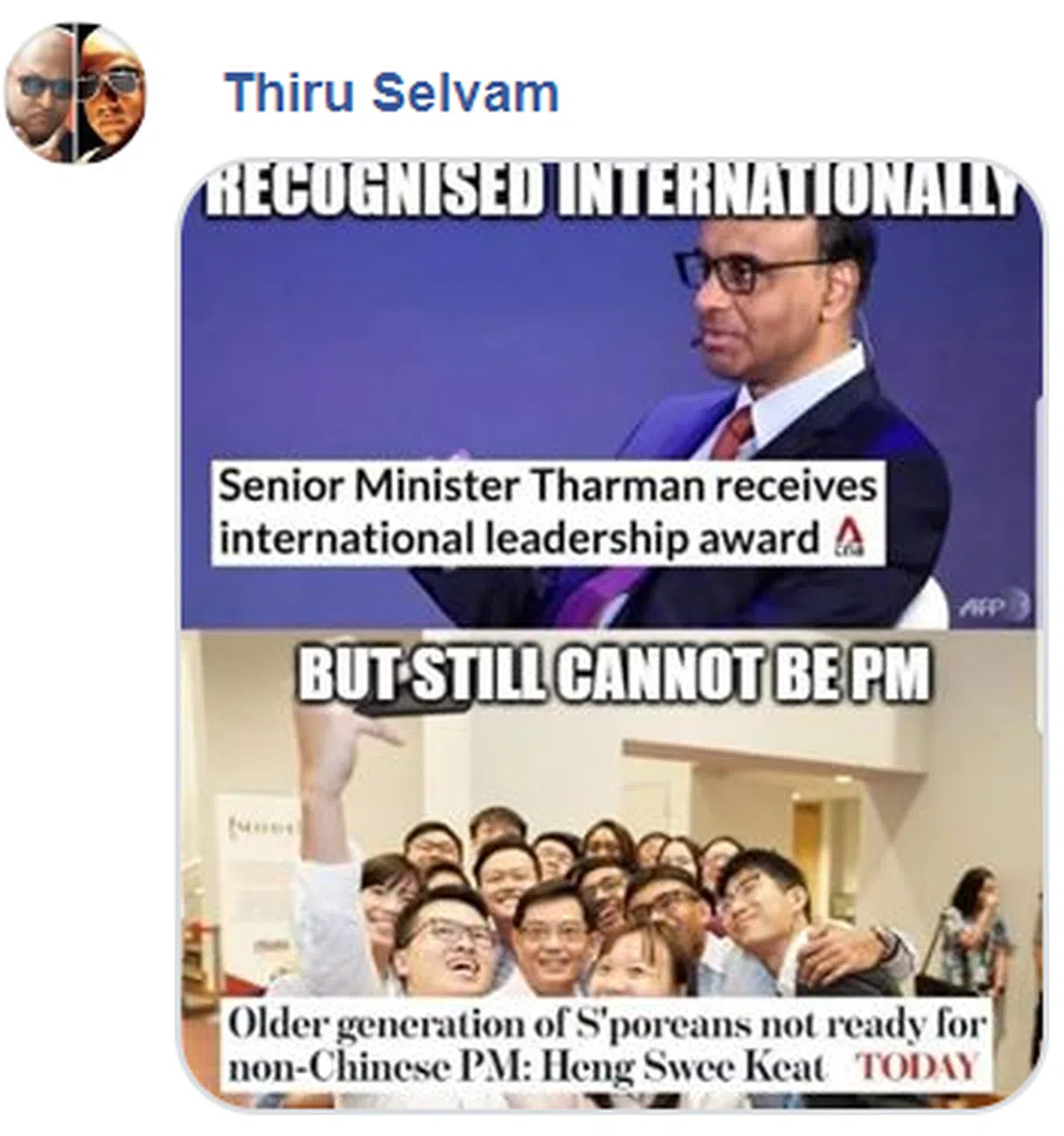 对新加坡的吃瓜群众来说,尚达曼所获得的奖项具体意义是什么并不重要,重要的是他一再证明他的能力在国际上受到崇高的认可,网上不少人因此又借机起哄,为什么这样能干的人才就不能当总理,就因为他是“非华人”吗?