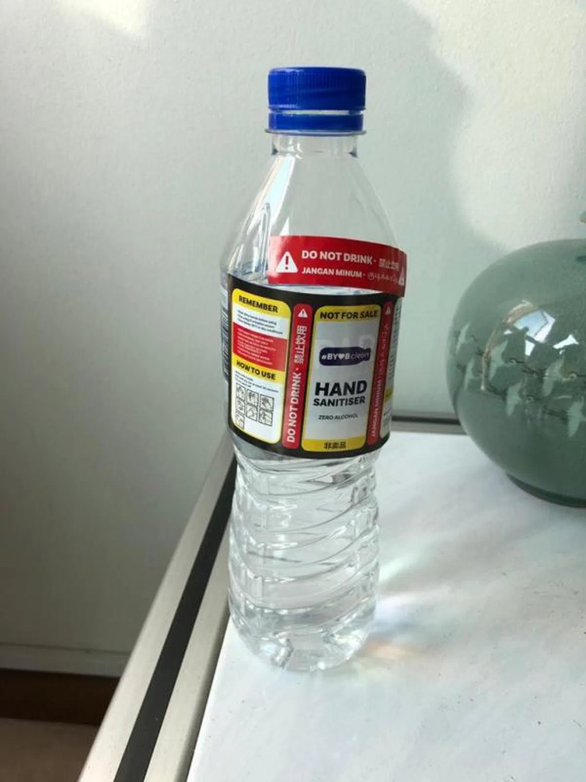 “不用你操心,政府已经顺便帮你在瓶子上贴上sticker啦,注明是消毒液不可饮用!”