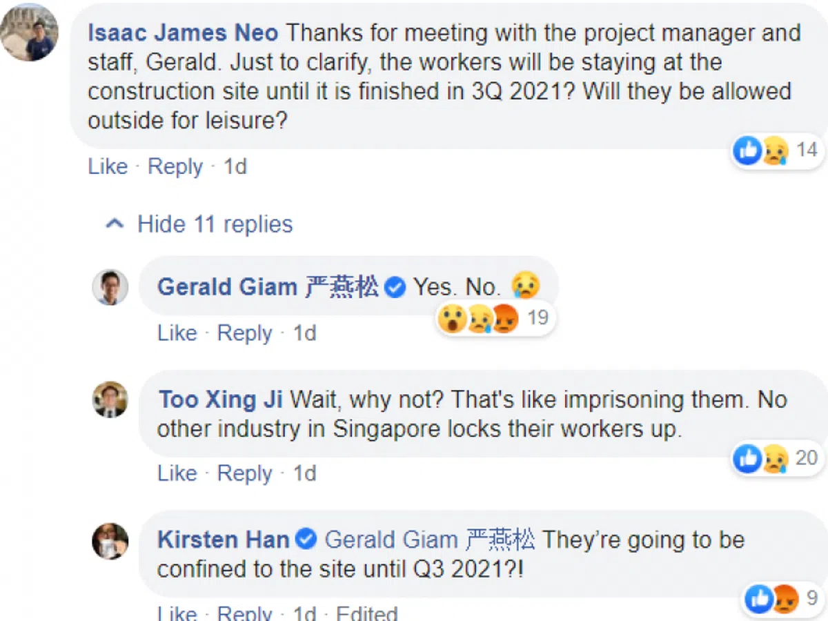 这根本是在变相囚禁客工。客工们并非犯人,怎能如此对待?新加坡其他行业都没有这么做!新加坡政论网站作者韩俐颖(Kirsten Han)也留言表示震惊。
