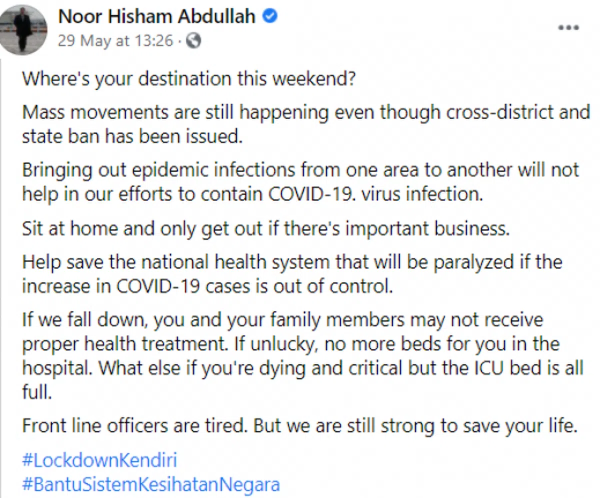 可当首相慕尤丁5月28日宣布从6月1日起全国全面封锁两周后,隔天早上数个大道更出现车龙,连卫生总监诺希山也忍不住在社交媒体贴文写道: