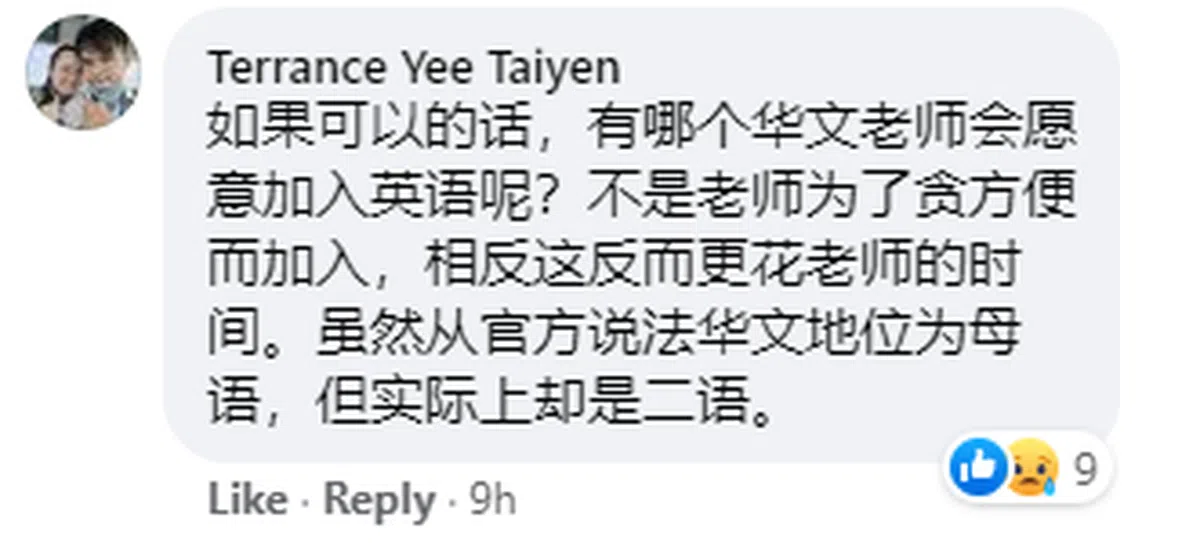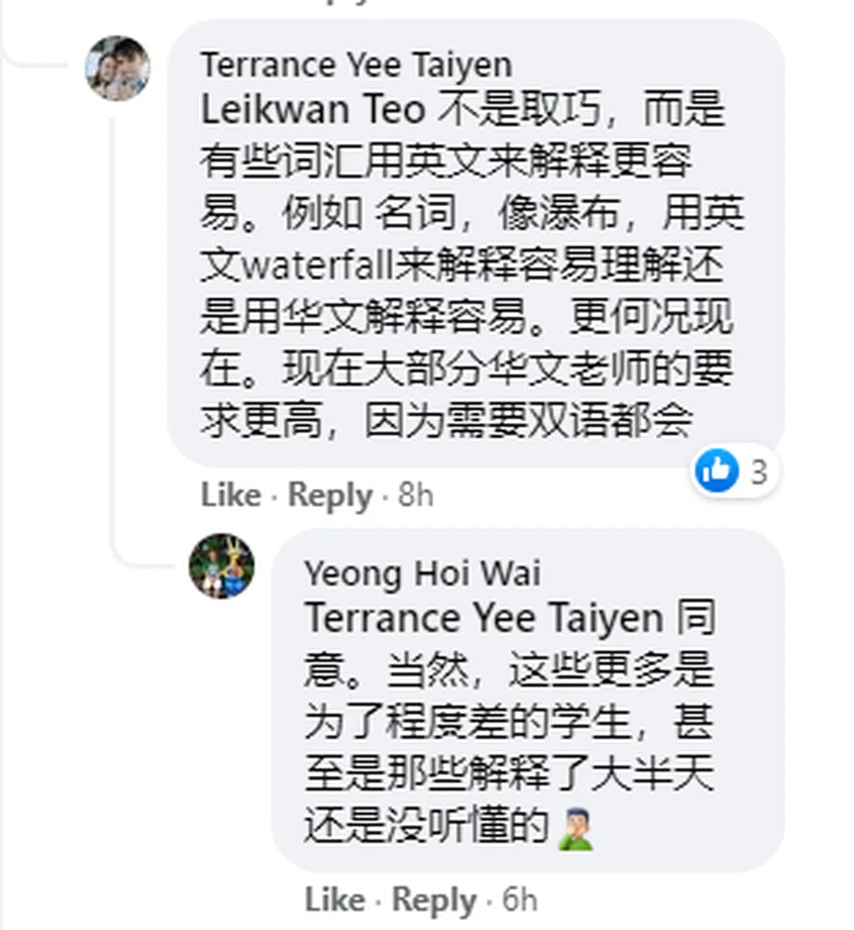 有华文老师语带无奈地站出来声援同行说,有些学生的华文程度实在太差,花了很长时间用华语解释,学生也听不懂,只能以他们能听懂的英语来解释了。