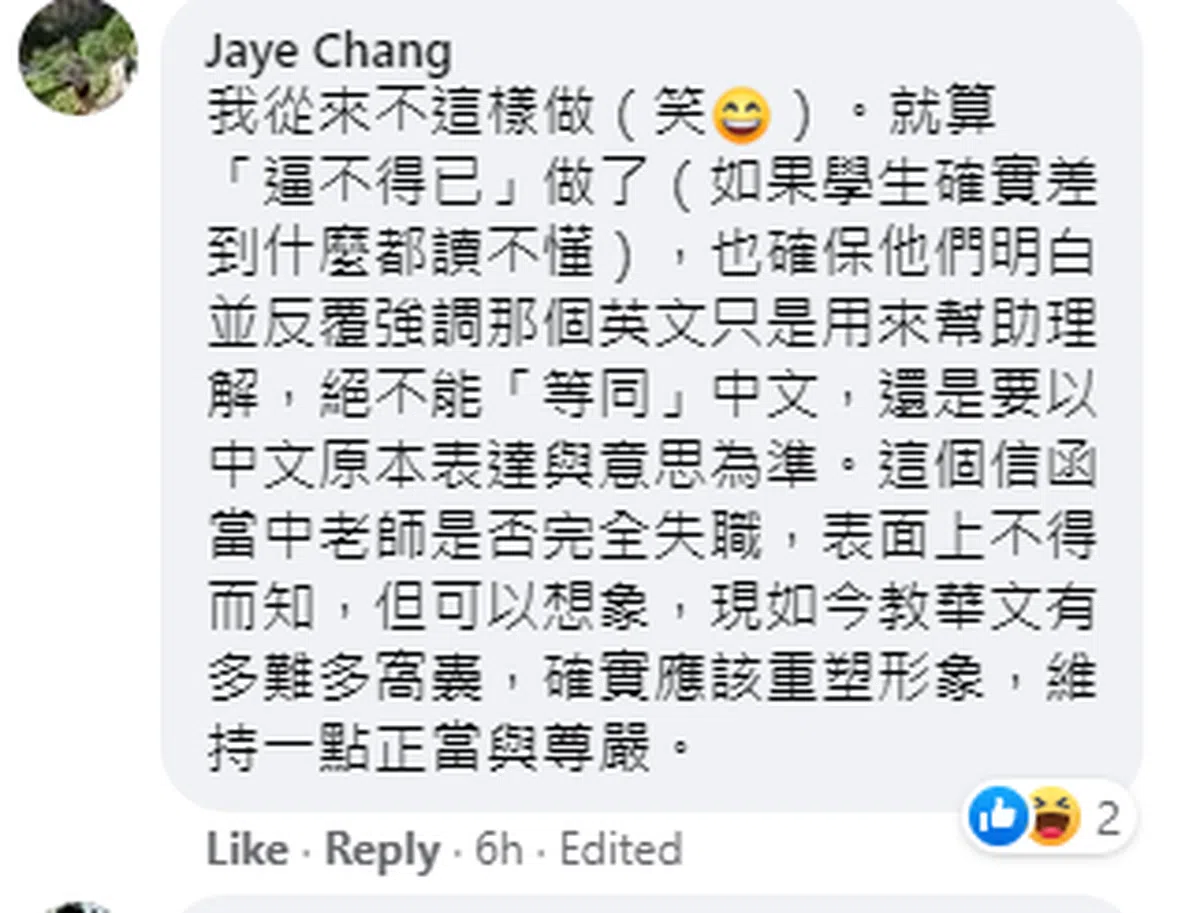 然而,网民的意见也不完全没道理。老师给出了英文解释,确实在某种程度上,变相剥夺了华文程度较好学生的学习机会。