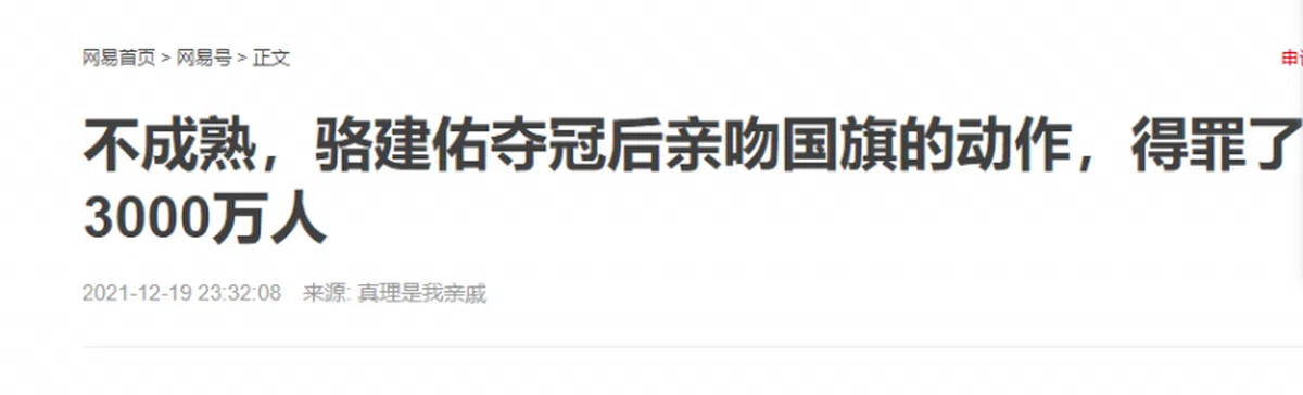 比较“耐人寻味”的是中国媒体《网易》发了一则以《不成熟,骆建佑夺冠后亲吻国旗的动作,得罪了3000万人》为题的新闻。