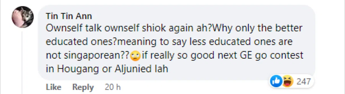 “为什么只提受过更高教育的人?意思是受教育较少的人不是新加坡人吗?真的那么厉害,就在来届大选到后港或阿裕尼竞选啦。”
