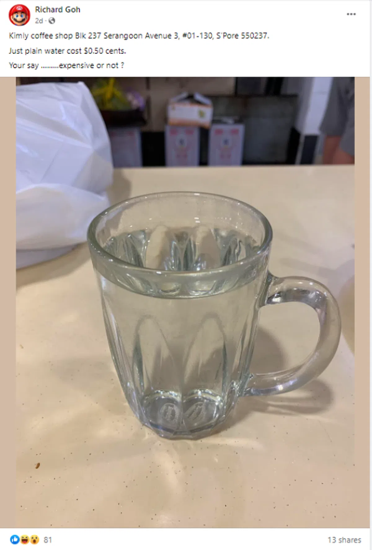 有网民近日在脸书专页“Complaint Singapore”(投诉新加坡)申诉,到位于实龙岗3道第237座组屋的咖啡店吃饭,饮料摊的一杯白开水竟卖5角,让他觉得贵得离谱。