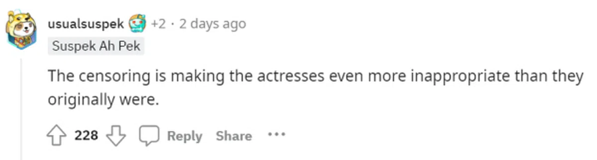 嗯,不就是各国女明星一般走红地毯参加颁奖典礼都会出现的衣着剪裁吗?照这标准,本地《红星大奖》估计也要马赛克打好打满了吧?