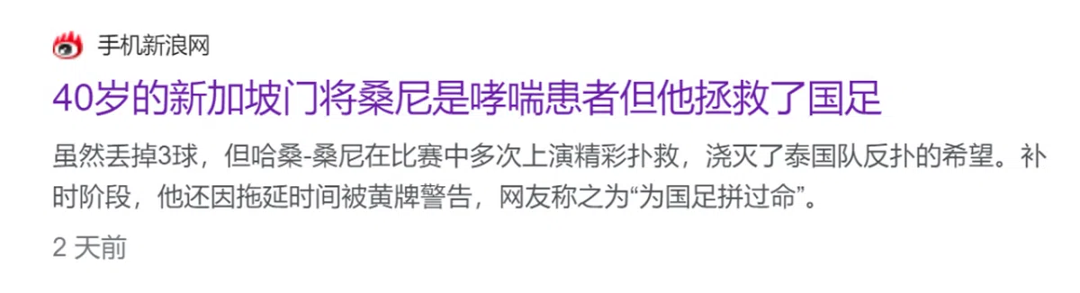 中国网站凡是关于哈山的新闻,标题(下图)都是字字嘲讽,言下之意笑话中国国足晋级,全靠一个40岁快退役的、有患哮喘病史、业余还卖椰浆饭的新加坡门将,竟让中国队“躺”进十八强。
